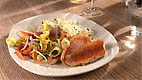 ... Blattsalate mit Zucchini, Paprikawürfeln, Radieschen, Kirschtomaten, gebratenem Hähnchenspieß und French-Dressing