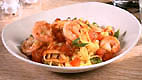 ... Tagliatelle mit Tomatensugo, Frühlingslauch und gebratenen Scampi. Auf Wunsch mit Parmesan
